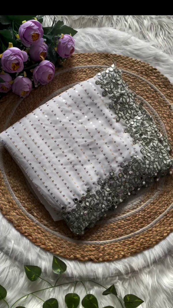 Intricate Silver Embroidery Adorned with fine silver embroidery, the saree sparkles subtly, adding a luxurious touch. The detailed work enhances its regal appeal for festive and formal events.