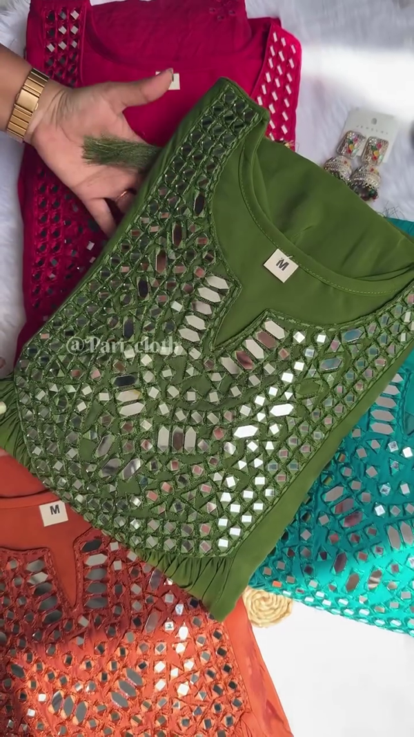 Intricate Mirror Embellishments Delicate mirror work detailing adds shimmer and sophistication to each top. The embellishments are thoughtfully placed to create a balanced and eye-catching ethnic look.