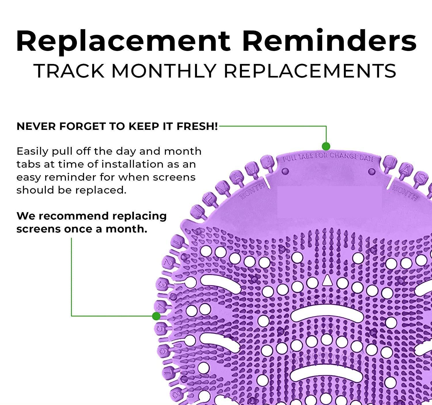 Reduces Splash Patented bristle helps eliminate urine splash back. These mats fit over the drain and act as a net. To prevent debris from getting caught in the drainage system. Fits Esily Flexible design conforms to all urinals, ideal for men classic and water free urinals. Anti Bacterial Contains anti bacterial that consumes odors and keeps drains clean and clear. Drains Easy Urinal screens are effective means of keeping urinal drains free flowing. These mats fit over the drain and act as a net to catch debris
