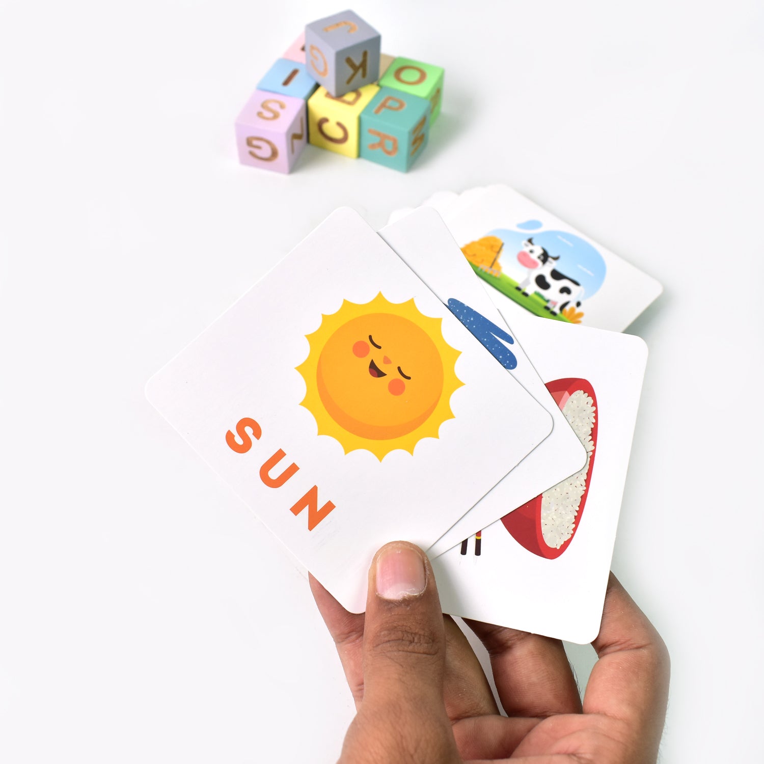 【Spelling & Reading Educational Toys】- The kids can recognize objects based on each flash cards picture, or spell out corresponding words with letter cubes. Color pictures increase kids interest in learning and use cubes to spell words flexibly to improve children's memory.Great kindergarten learning games for kids 5-7.