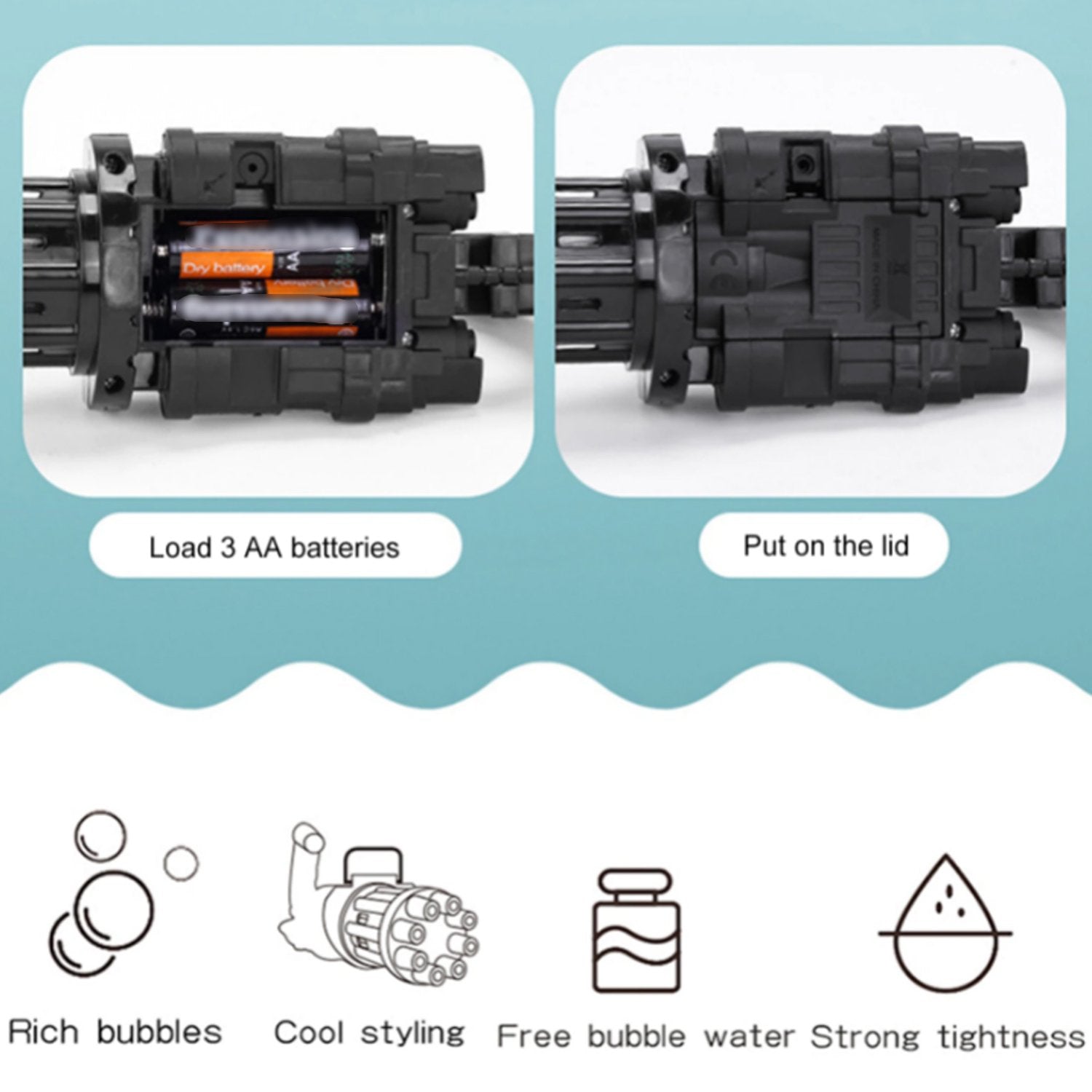 EASY TO USE. You only need to install three AA batteries (not included batteries), just pour the bubble water on the spare board, immerse the muzzle of the bubble gun in the bubble water, and then press the switch to enjoy the bubble time.